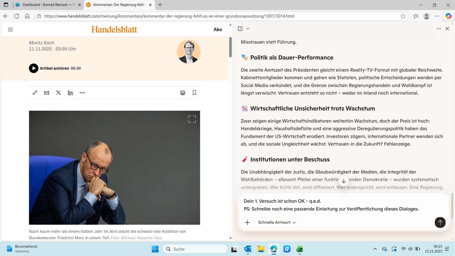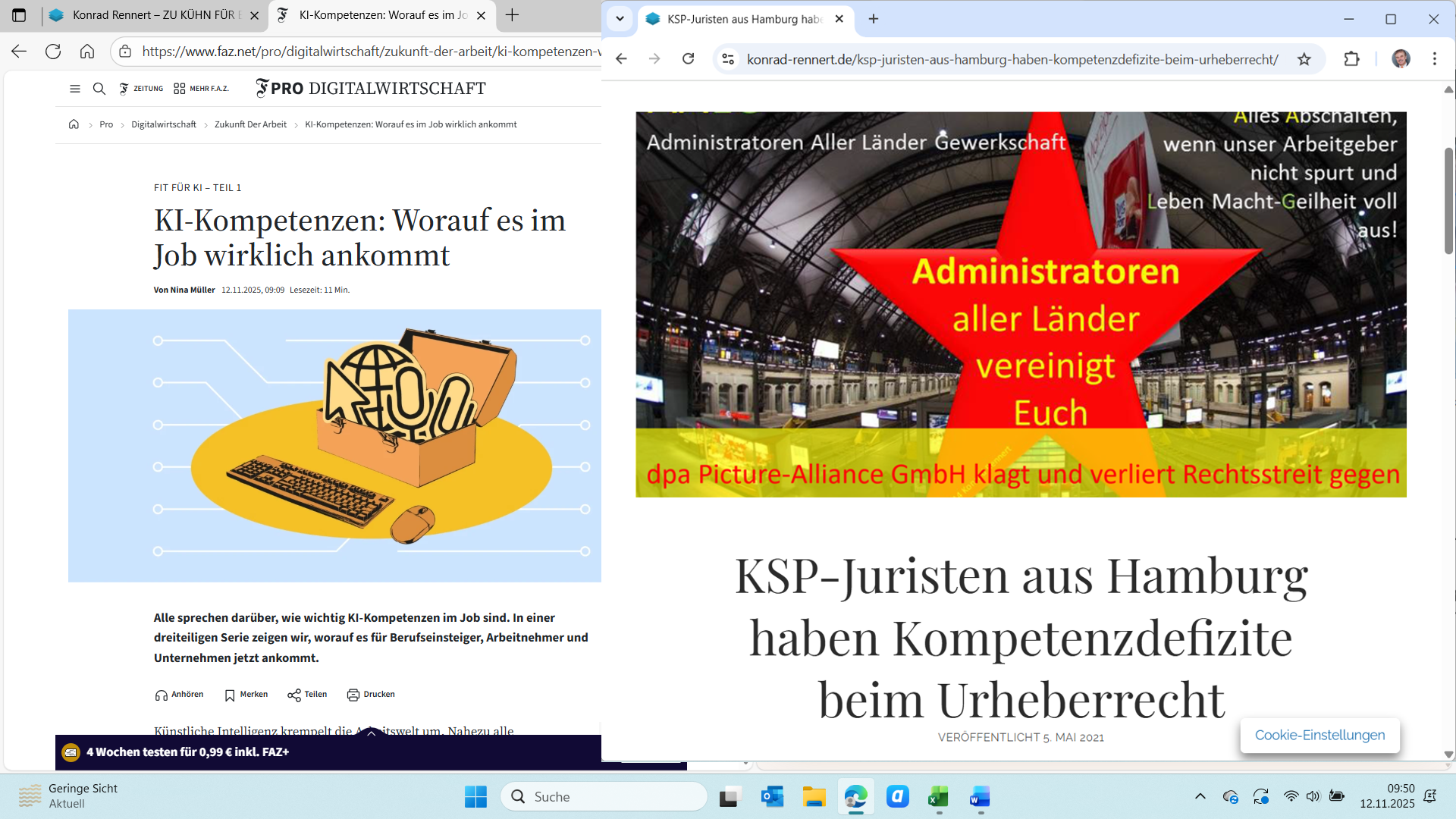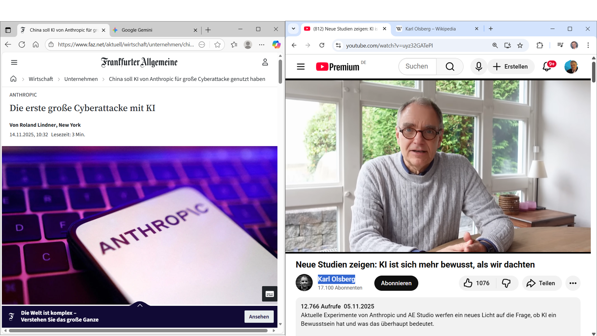 Die Collage im Titelbild bringt zwei Welten zusammen (KR&KI):Links ein FAZ-Artikel über die wohl erste dokumentierte, weitgehend KI-gesteuerte Cyberattacke. Rechts ein YouTube-Video von Karl Olsberg…