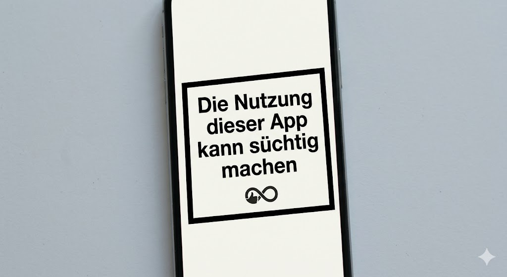 … und gestalte ein pointiertes Startbild, welches am Anfang jeder Nutzung von Social Media gezeigt wird … „Die Nutzung dieser App kann süchtig machen“