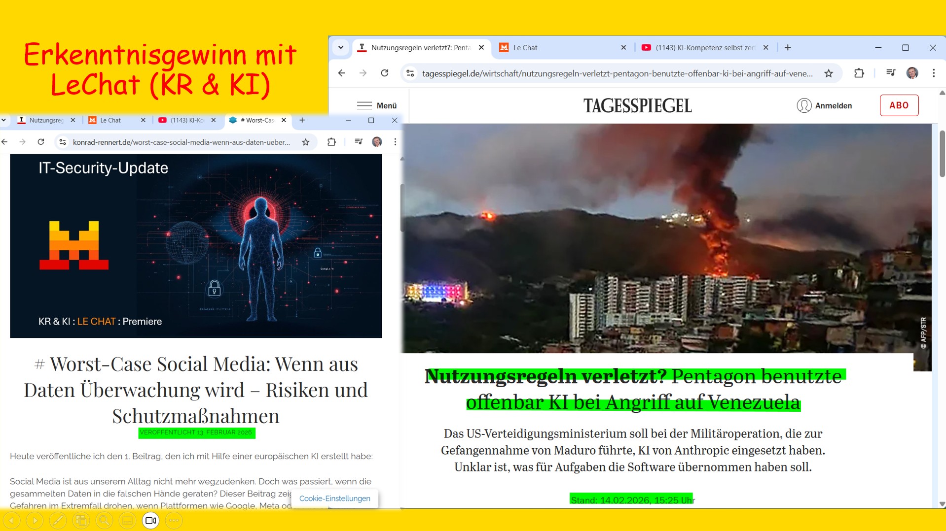 *„Wenn aus Daten Überwachung wird, wenn KI-Systeme im Geheimen agieren, und wenn Militärs Technologie nutzen, ohne Rechenschaft abzulegen – dann ist es Zeit für eine kritische, öffentliche Debatte. Genau das haben LeChat und ich in den letzten Tagen getan: Wir haben den Tagesspiegel-Artikel über den KI-Einsatz des Pentagons in Venezuela analysiert – nicht als passive Leser, sondern als gestaltende Dialogpartner.