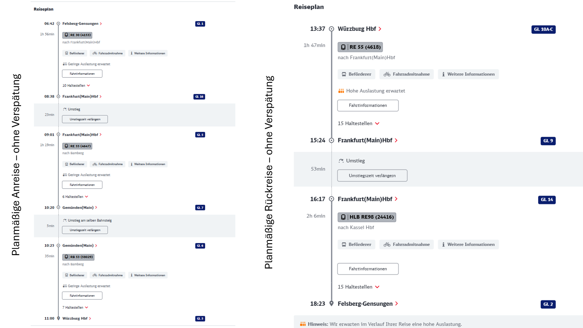 | Hinreise (15.11.) | Zwei komplette Verbindungen, die nicht über Kassel und Frankfurt führen. |