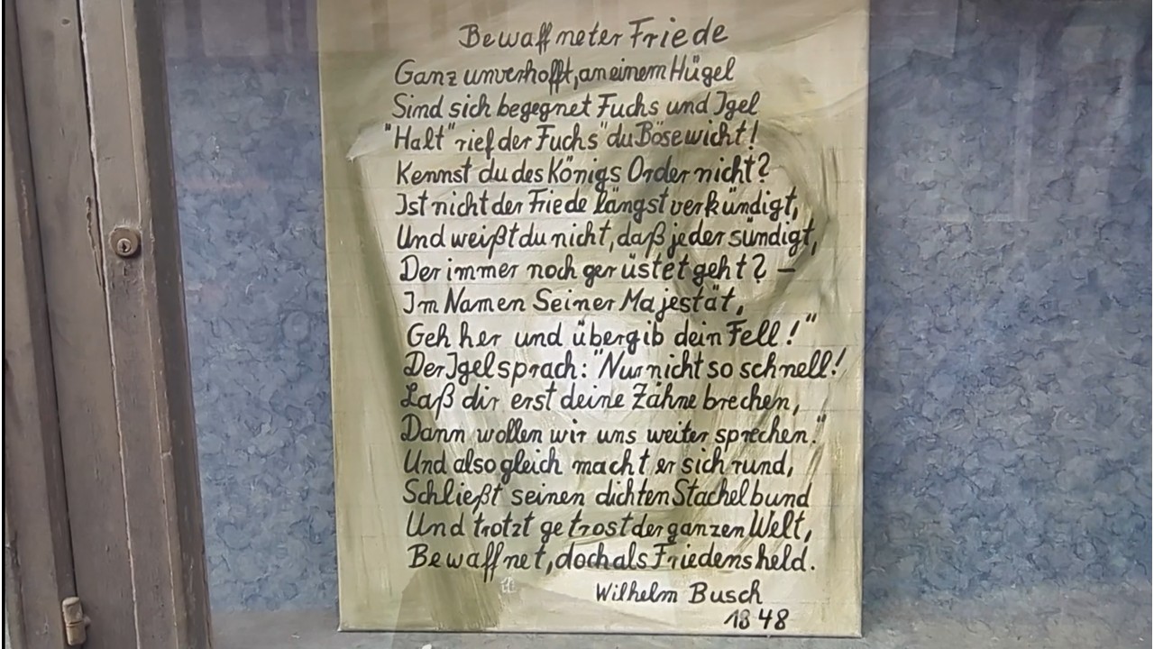 Busch beschreibt in seinem Gedicht den Igel, der sich „beim heil’gen Friedensfeste“ bewaffnet, weil er dem Frieden nicht traut.