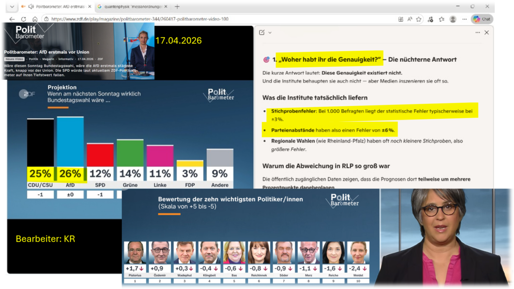 Das Titelbild visualisiert das Dilemma: Während Medien eine Differenz von 1 % (AfD 26 % vs. Union 25 %) als politisches Beben inszenieren, würde jeder Physik-Professor das Protokoll mit dem Rotstift zücken.