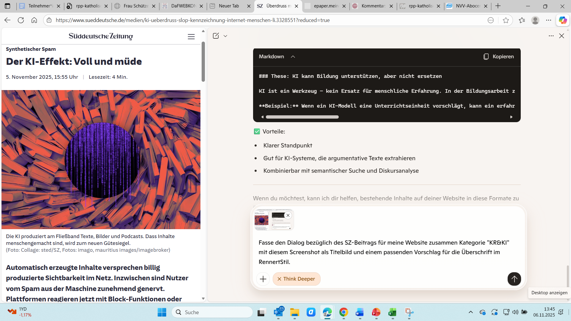- Alt-Text: Screenshot: SZ-Artikel „Der KI-Effekt: Voll und müde“; farbige abstrakte Grafik; Tool-Interface mit Markdown-Notizen.