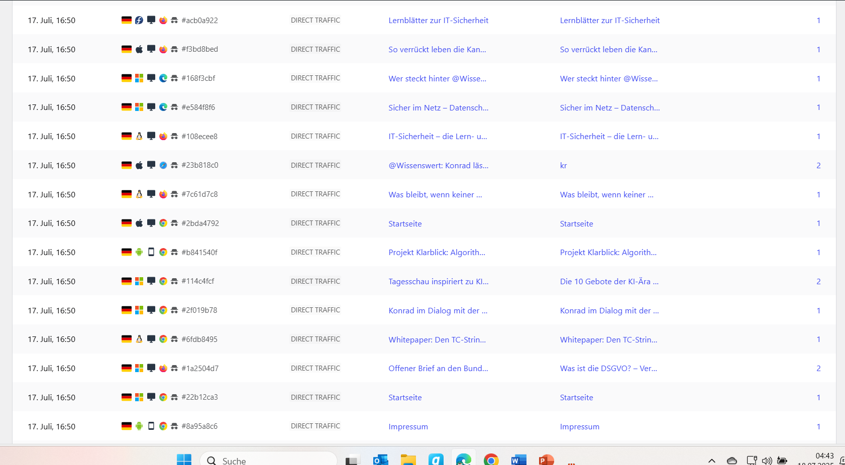 Am 17. Juli 2025 verzeichnete mein WordPress-Dashboard eine Reihe von „Direct Traffic“-Zugriffen aus Deutschland – ein Umstand, der an sich schon ungewöhnlich ist, da deutsche Zugriffe auf News@KonradRennert eher selten sind. Das wirklich Pikante: Sie fanden zeitgleich um 16:50 Uhr statt und verteilten sich über verschiedene Inhalte, von den „Lernblättern zur IT-Sicherheit“ über „Konrad im Dialog mit der KI zum Thema ‘Arabischer Frühling’“ bis hin zu den „DSGVO-Erklärungen“.