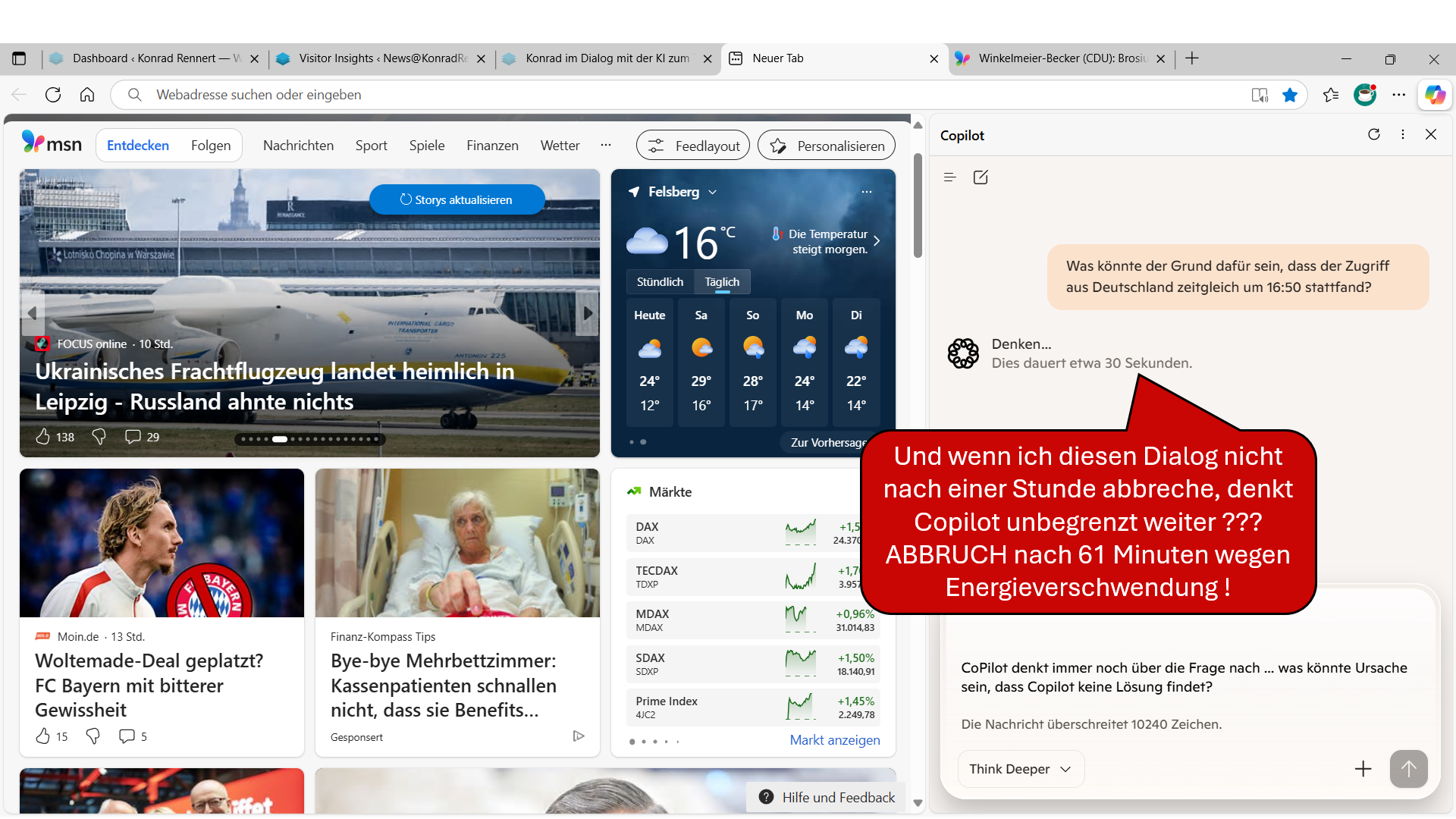 Doch dann kam der spannende Moment: Ich präsentierte die gleiche Frage einer anderen KI-Instanz, die als „CoPilot“ bekannt ist und oft für spezifischere, assistierende Aufgaben eingesetzt wird. Und hier zeigte sich eine bemerkenswerte Reaktion: CoPilot begann zu „denken“, eine sichtbare Verzögerung trat auf, begleitet von der Meldung „Dies dauert etwa 30 Sekunden“.